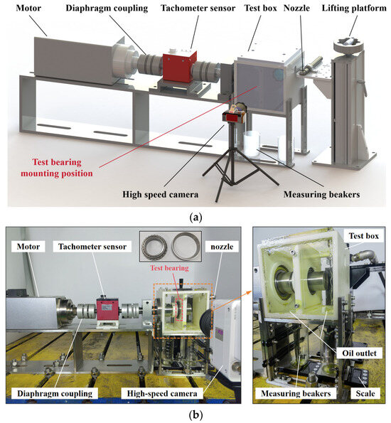 Tapered roller bearing jet lubrication test rig: (a) test rig schematic diagram; (b) test rig physical picture.