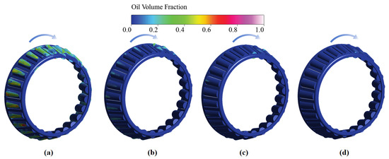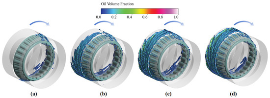 Lubricating oil distribution of the bearing chamber at various oil flow rates (where the rotating speed is 3000 rpm with a lubricant volume fraction of 0.1): (a) 70 L/h; (b) 85 L/h; (c) 105 L/h; (d) 120 L/h.