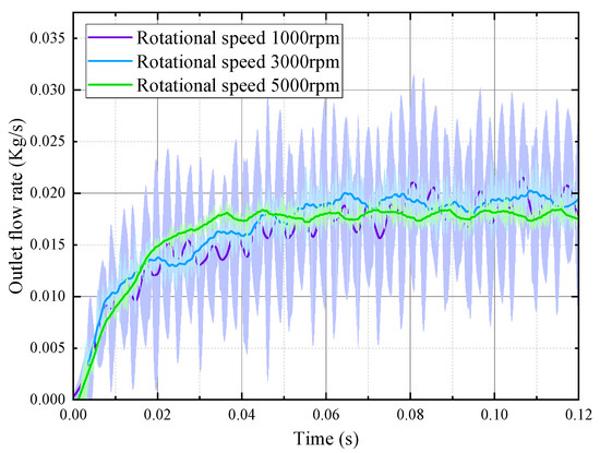 Figure 9 shows the variation in flow velocity at the outlet on one side of the bearing under various rotational speeds. As the bearing speed increases, the time for the outlet flow velocity to reach stability also decreases, while the fluctuations in flow velocity gradually diminish. It takes the longest time to reach the steady state, at about 0.09 s, at a bearing speed of 1000 rpm. Therefore, to ensure that the flow field in the chamber reaches a steady state, the simulation calculation time was set to 0.15 s in this paper.