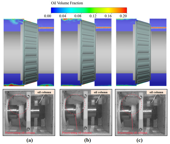 Figure 10 shows the comparison between the experimental and Fluent simulation of the lubricant distribution in the bearing chamber at 0.15 s. The high-speed camera images of the test show that as the rotational speed increases, the oil column passing through the tapered roller bearing becomes progressively shorter (as indicated by the red circle in Figure 10). Additionally, more oil from the left chamber splashes onto the wall of the box, while there is no significant change in the right chamber wall. This observation closely matches the cross-sectional oil volume distribution obtained from the simulation.