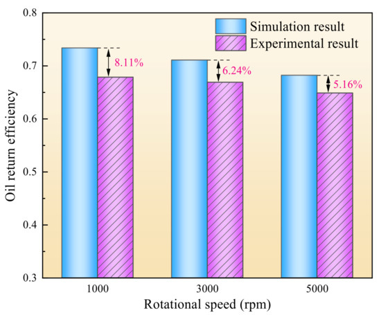 Figure 11 presents a comparison between the oil return efficiency tests and simulations. The results indicate that the oil penetration rate, which characterizes the oil return efficiency for both the simulation and the test, decreases progressively with increasing rotational speed. The measured oil penetration rate from the test and the numerical simulation results exhibit a similar trend, with specific relative errors of 8.11%, 6.24%, and 5.16%, respectively, all of which are maintained within 10%. Here, the oil penetration rate is defined as the ratio of the oil return flow to the oil supply flow, i.e., the proportion of oil returned compared to the amount of oil supplied during the same time period. While the oil supply can be accurately measured, the experimentally determined oil return quantity may be underestimated due to small amounts of residual oil remaining in the rolling bearing test box. Consequently, the experimental findings are slightly lower than the numerical results. Overall, this confirms the consistency between the test and the simulation, thereby validating the accuracy of the numerical simulation model. Additionally, it can be observed in Figure 11 that the test oil return efficiency is consistently slightly lower than the simulation, potentially due to vibrations in the test box caused by the rotating motor of the test stand, which may shift the jet point and introduce errors.