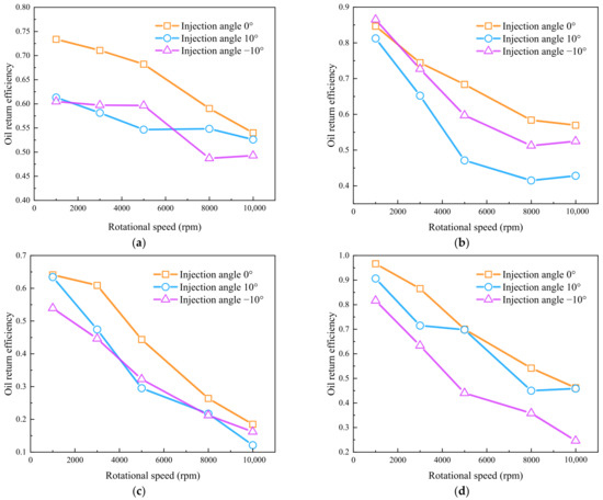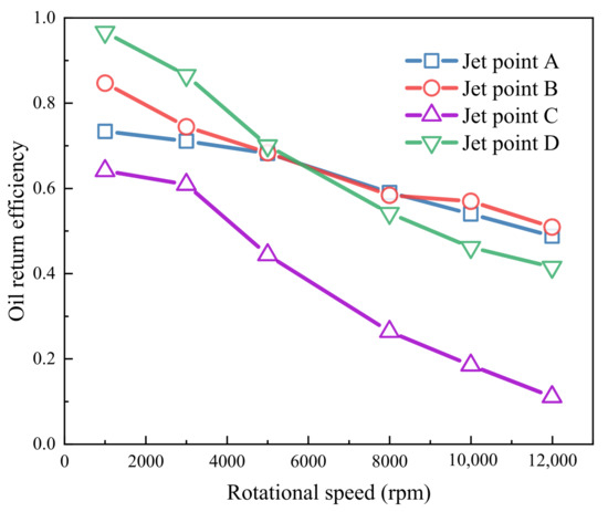 Figure 26 depicts the variation in oil return efficiency with rotational speed for different positions and different pitch angles of incidence. The findings indicate that the oil return efficiency of the oil-positive jet is optimal when the jet is directed at various angles. Figure 26a shows that at jet point A, the oil return efficiency of the downward and upward jets does not differ much, and the oil return efficiency of the incoming shots at each angle gradually converges with the increase in rotational speed. Figure 26b shows that at jet point B, the oil return efficiency of the upward jet is greater than that of the downward jet, and the decreasing trend of the oil return efficiency of the incoming shot at each angle with increasing rotational speed gradually slows down. Figure 26c shows that at jet point C, the oil return efficiency of the downward and upward projections does not differ much, and the oil return efficiency of the incoming projections from all angles converges as the rotational speed increases. Figure 26d shows that the oil return efficiency of the upward jet is less than that of downward jet at jet point D, where the downward jet (10°) and lubrication performance are very close to the oil-positive spray oil return efficiency.