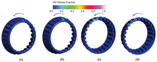 The distribution of the lubricating oil volume fraction in the fluid domain as a function of time (where the rotating speed is 3000 rpm): (a) 0.025 s; (b) 0.05 s; (c) 0.075 s; (d) 0.1 s.
