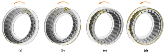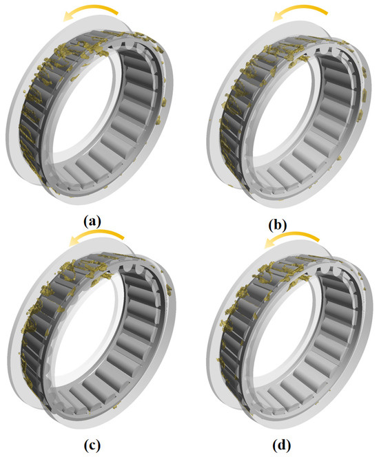 Position A: lubricating oil distribution of rolling elements in bearing: (a) 1000 rpm; (b) 5000 rpm; (c) 8000 rpm; (d) 12,000 rpm.