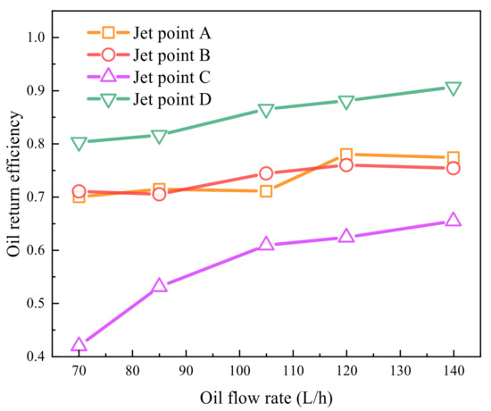Oil return efficiency at different oil flow rates (where the rotating speed is 3000 rpm).