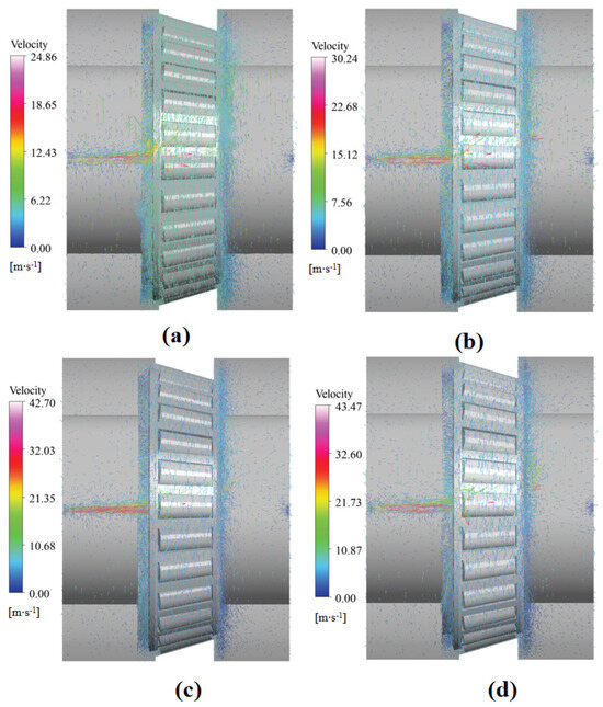 Velocity vector in the bearing chamber at various oil flow rates (where the rotational speed is 3000 rpm): (a) 70 L/h; (b) 85 L/h; (c) 105 L/h; (d) 120 L/h.