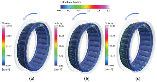 Vector plot of bearing roller lubricant distribution versus velocity in the bearing chamber at different nozzle diameters (where the rotating speed is 3000 rpm): (a) nozzle diameter 1 mm; (b) nozzle diameter 1.5 mm; (c) nozzle diameter 2 mm.