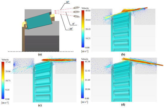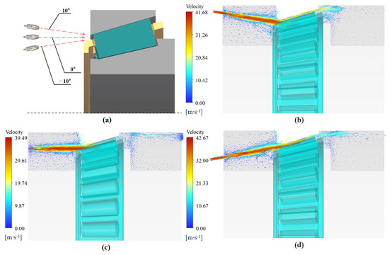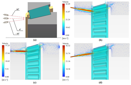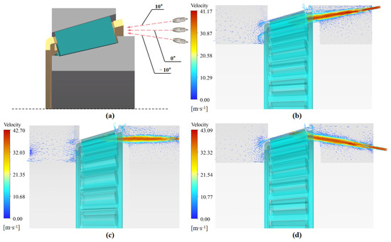 Vector plot of incident bearing cavity velocities at different angles at Position D (where the rotating speed is 3000 rpm): (a) incident diagram; (b) angle of injection 10°; (c) angle of injection 0°; (d) angle of injection −10°.
