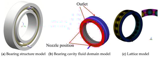 The 7008C angular contact ball bearing is taken as the object, and its structural parameters are shown in Table 1. The bearing structure, as well as the fluid domain model, is shown in Figure 1. The model includes the fluid domain in the bearing cavity and the nozzle. The bearing fluid domain model is meshed with polyhedral meshing using FLUENT Meshing 2022, a mesh type with strong automatic generation capability and a large number of neighboring cells, resulting in good convergence performance and high accuracy. The minimum orthogonal mass of this mesh model is 0.5, which is greater than 0.1 and has good convergence for flow field analysis.