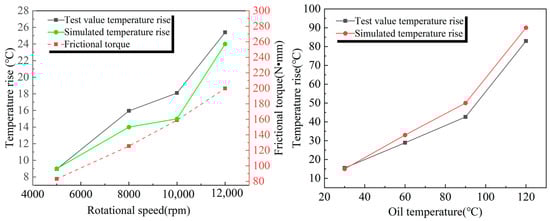 Simulation values and experimental values of the outer ring of the bearing at different speeds and oil temperatures.