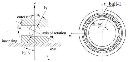 Foord, C. A. [24] provides a method for calculating this axis. As shown in Figure 4, the angle between the axis of rotation of the ball and the axis of rotation is β0, which is equal to half of the sum of the contact angle between the inner and outer rings of the ball bearing and the ball, i.e., β0 = (α1 + α2)/2. In this paper, we select the angular contact ball bearing 7008C with a contact angle of 15°. In order to simplify the analysis of the bearing structure, α1 = α2 = 15° is set so that we can obtain β0 = 15°.