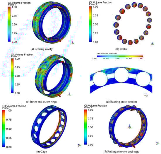 During high-speed rotation, the uniform distribution of lubricating oil within the bearing effectively reduces friction and wear, lowers operating temperature, and prevents direct contact between metal surfaces. The distribution of lubricating oil within the bearing cavity is shown in Figure 5a–c. The lubricating oil distribution on the steel ball surface is higher than that on the outer ring, while the lubricating oil distribution on the inner ring surface is relatively low.