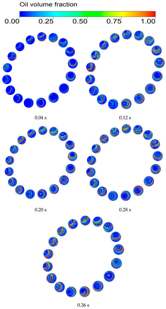 As shown in Figure 6, in the initial stage of the bearing startup (0.04 s), the lubricant is still in the initial diffusion and distribution process, the amount of oil on the surface of the rolling body is small and appears as a dot, and the lubricant is mostly concentrated at the steel ball near the nozzle.