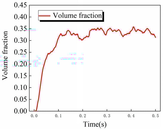 In order to further analyze the change rule of the lubricant on the surface of the rolling body, the volume fraction of the lubricant on the surface of the steel ball is weighted and averaged. As shown in Figure 7, the average oil volume fraction on the surface of the steel ball increases gradually with time change, reaches the maximum at about 0.1 s and begins to stabilize, and floats up and down between 0.3 and 0.35.