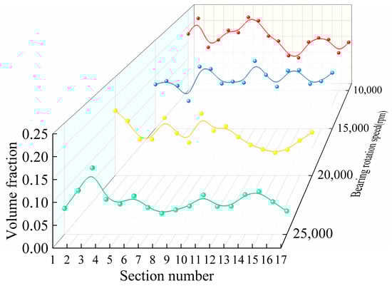 Starting at the upper nozzle, 17 locations were uniformly intercepted at 21.17° intervals along the counterclockwise direction to calculate the oil volume fraction, as shown in Figure 8. The oil volume fraction in each cross-section was weighted and averaged. The average value is obtained by considering the relative area weights of each region in the overall cross-section to more accurately represent the distribution of the oil fluid over the entire cross-section. As can be seen from Figure 9, at the same injection volume, the variation in the oil volume fraction in each cross-section at different rotational speeds is not the same, and the oil volume fraction gradually decreases as the rotational speed increases. At lower rotational speeds, the volume fraction of oil in each cross-section is higher; at higher rotational speeds, the volume fraction of oil in each cross-section is lower.