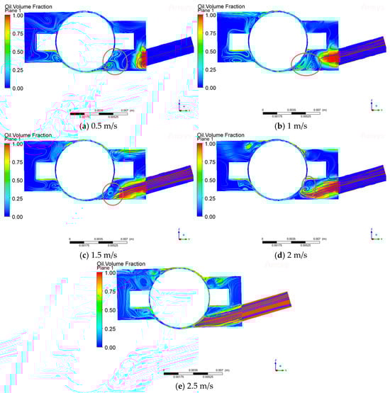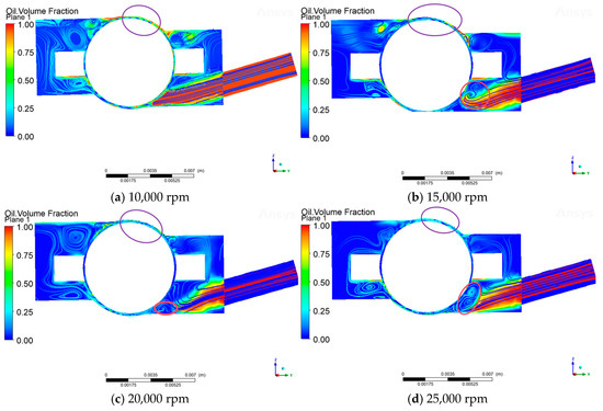 As can be seen from Figure 11, when the bearing speed is 10,000 rpm and the oil injection speed is 2.5 m/s, the vortex between the rolling body of the bearing and the outer surface of the inner ring is not obvious, and the lubricant can reach the lubrication point smoothly. When the injection speed remains unchanged, as the speed increases, the shear force of the air curtain is directly proportional to the bearing speed, and the air curtain strength increases, resulting in the end of the lubricant being pulled up by the airflow, in the steel ball, and the inner ring of the contact area to form more and more obvious vortexes (red circle in the diagram). The lubricant carries the kinetic energy, which is difficult to overcome, by speed to enhance the significant enhancement of the shear effect of the curtain. The kinetic energy carried by the lubricant is difficult to overcome the air curtain shear effect, which is significantly enhanced by the speed increase, resulting in the lubrication point of the transportation process being blocked. More critically, as the speed increases, the oil-phase volume fraction in the contact area between the steel ball and the outer raceway shows an obvious decreasing trend (purple circle in the diagram), which directly affects the lubrication performance of the rolling body contact surface. According to (Figure 9), with the increase in bearing speed, the oil volume fraction of each monitoring cross-section shows a significant decreasing trend, and this phenomenon indirectly verifies the enhancement of the air curtain effect in high-speed working conditions.