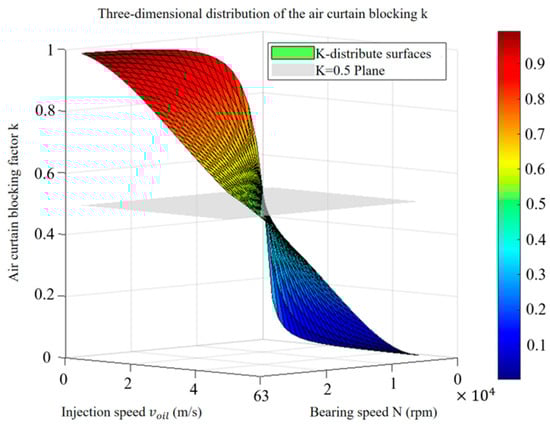 In order to quantitatively express the influence mechanism of oil injection speed and rotational speed on the air curtain effect of the angular contact ball bearing 7008C, this study defines the blocking coefficient K (see Equation (16)) as an evaluation index of the intensity of the air curtain effect, whose physical significance indicates the effective ability of the lubricant to penetrate the air curtain barrier to reach the lubrication point. Based on this parameter, the interaction between the oil injection volume and the bearing speed is investigated through the simulation results, which in turn reveals the influence of both the strength of the air curtain effect and the lubrication efficiency.