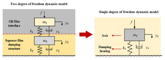 The ISFD–PSSS can be equivalent to a two-degree-of-freedom spring mass system. Its comprehensive dynamic characteristics can be obtained by combining the dynamic characteristics of the lubricant film and the damping bearing, as shown in Figure 5. f is the external excitation force, k1 and c1 are the stiffness and damping coefficients of the lubricant film, respectively, derived from the vertical main stiffness kyy and damping coefficient cyy of the bearing liquid film. The specific calculation method is elaborated in Section 3.1.2. m1, m2 are the masses of the shaft and damping bearing, respectively. The stiffness and damping coefficients of the bearing equipped with the ISFD damper are k2 and c2. Given that the stiffness of the damping fluid within the damping structure is almost negligible compared to the structural stiffness, k2 is defined as the static stiffness of the damping bearing structure, which is derived from the data presented in Figure 4.
