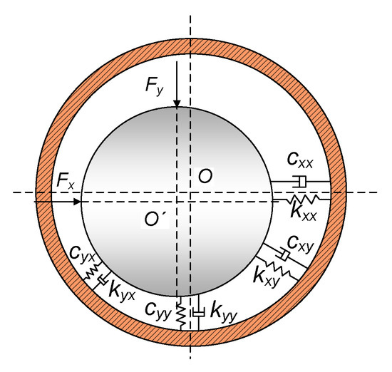 The stiffness and damping coefficients of the lubricating oil film are solved via partial differentiation. The formulation in Equation (11) incorporates film pressure p derived from our established bearing elastohydrodynamic lubrication model [33].
