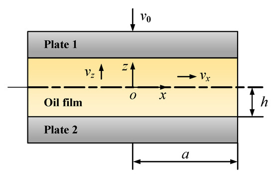 The S-type damper can be modeled as the superposition of multiple single-layer plates, with their extrusion model illustrated in Figure 7. Note that Figure 7 employs a local coordinate system where the z, x, and y denote the vertical, horizontal, and axial directions of the bearing, respectively. For the remainder of the paper, these directions are defined relative to the y, x, and z, respectively. The clearance in the extrusion model is 2h, with plate length 2a and width 2b; the relative velocity between plates is v0, and oil flow velocities along the x and z directions in the clearance are vx and vz (no flow along the y direction); the lubricant pressure is p, ambient pressure is Pa (set to zero in this simulation). In addition, the masses of the shaft and the damping bearing are m1 and m2, respectively.