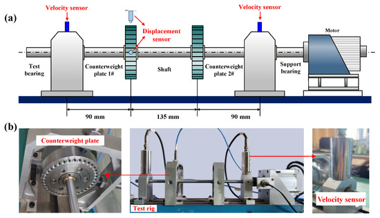 The drive part of the test rig was driven by a DC parallel-excited motor with a rated current of 2.5 A and an output power of 250 W. The stepless speed regulation of the motor can be realized by manually adjusting the output voltage of the regulator. The test bearing was installed at the end of the test rig. The inner diameter of the test bearing is 10 mm, and the bearing length is 25 mm. Two counterweight plates were installed on the rotating shaft, and unbalanced bolts were installed on counterweight plate #1 to provide an unbalanced load. The size of the counterweight plate was Φ76 × 19 mm, and the mass was 600 g.