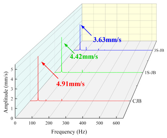 Figure 10 shows the vibration frequency spectrum of the test bearings under 3000 r/min and 500 cst of damping fluid. It can be observed that the damping structure does not affect the spectral characteristics of the rotor system. The frequency corresponding to the highest spectrum peak of 1S-JB and 3S-JB bearings is similar to that of CJB, but the amplitude is lower than that of CJB, and the amplitude of 3S-JB is the lowest, indicating that the vibration-attenuation performance is the best under this working condition.