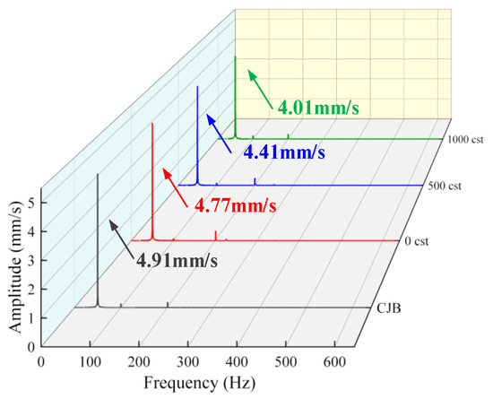 In this Section, CJB and 1S-JB are selected to further explore the influence of damping fluid viscosity on bearing vibration characteristics. Figure 14 demonstrates the comparison of the vibration frequency spectrum of the test bearings filled with different viscosity damping fluid under 3000 r/min and an unbalanced load of 15 g, where 0 cst condition means the damping structure is not filled. The spectral peaks of the 1S-JB at different viscosities are 4.77, 4.41, and 4.01, respectively, and the peak reduction ratios are 3.46%, 10.75%, and 18.84% compared with that of the CJB, indicating that the increase in the viscosity of the damping fluid can enhance the vibration damping capability of the ISFD structure under the working condition.