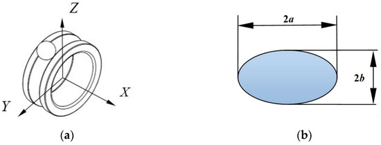 Based on the computational equations proposed in reference [19], this paper has developed a Python program using Python 3.7 to conduct numerical computations of the stress distribution in the subsurface of bearings. The calculation of subsurface stress in bearings considers two types of contact forms: line contact and elliptical contact. The contact form for ball bearings is elliptical, while that for roller bearings is line contact. Elliptical contact is one of the most prevalent modes in Hertzian contact theory. This study primarily focuses on angular contact ball bearings, which exhibit elliptical contact. The bearing coordinate system is illustrated in Figure 1a, where the Z-axis points into the subsurface, the Y-axis represents the direction of bearing motion, and the X-axis denotes the axial direction of the bearing. The YZ plane is the rolling plane of the bearing. The contact area between the steel ball and the raceway in Figure 1a is shown in Figure 1b. Elliptical contact is crucial for the numerical calculation of stresses in ball bearings, and the relevant equations for elliptical contact are presented below.