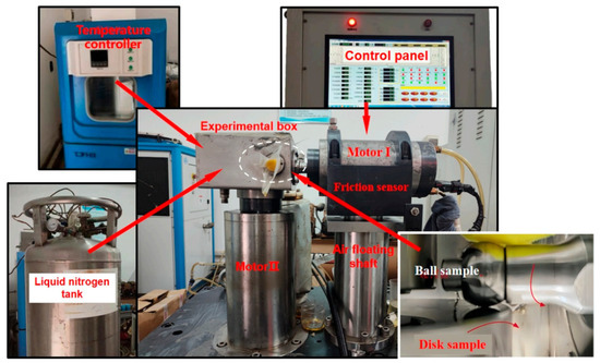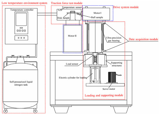 This paper presents the results of ball-on-disk traction tests conducted with MoS2 (molybdenum disulfide) coatings to investigate the variation of the traction coefficient of MoS2 solid lubrication with time under the same load. The ultra-low temperature, high-speed, and heavy-load solid lubrication traction force testing machine used in the tests is illustrated in Figure 3. It comprises a loading module, a lubrication module, a temperature control module, a power module, a traction force testing module, and an ultra-low temperature system. The schematic diagram of the traction testing machine is shown in Figure 4. The ball-on-disk test specimens are depicted in Figure 5.