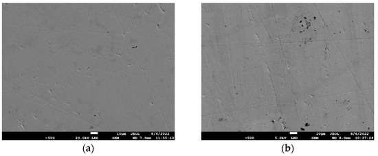 Surface microtopography of both the uncoated steel disk and the MoS2-coated steel disk was characterized using an JSM-7800F scanning electron microscope (JEOL Ltd., Tokyo, Japan), with the surface morphologies magnified by 500 times in Figure 6. Comparative analysis revealed that the MoS2 coating exhibited uniform texture, smooth surface finish, and superior preparation quality.
