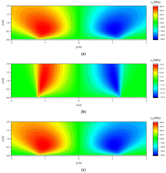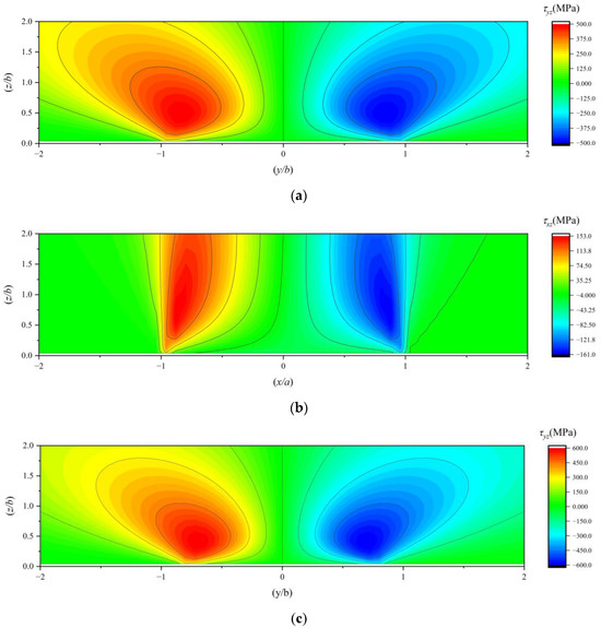 (a) The τyz under working condition 1; (b) the τxz under working condition 1; (c) the τyz under working condition 2; (d) the τxz under working condition 2; (e) the τyz under working condition 3; (f) the τxz under working condition 3.
