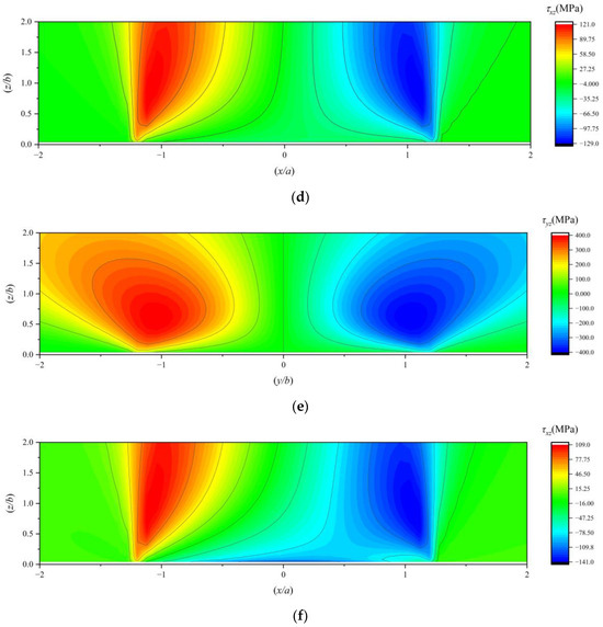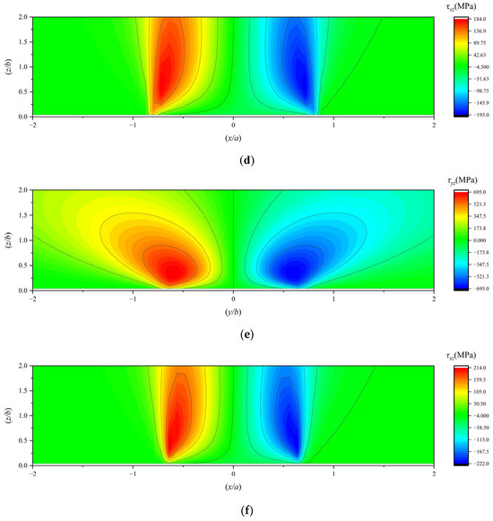 (a) The τyz under working condition 4; (b) the τxz under working condition 4; (c) the τyz under working condition 5; (d) the τxz under working condition 5; (e) the τyz under working condition 6; (f) the τxz under working condition 6.