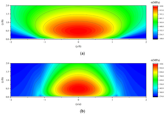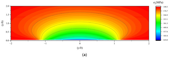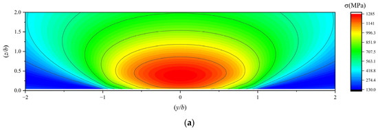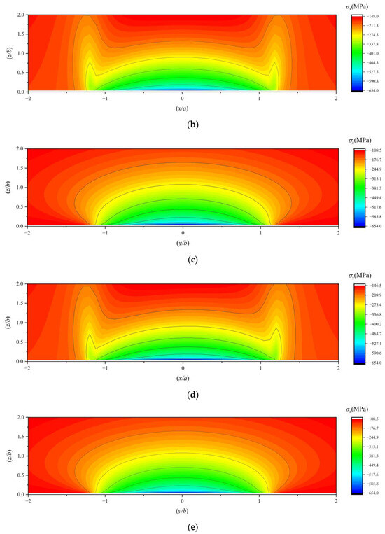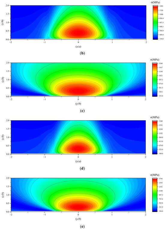 Under ultra-low temperature conditions, the material properties of GCr15 bearing steel undergo changes. The Young’s modulus slightly increases and is measured as 2.2 × 105 MPa, while the Poisson’s ratio slightly decreases and is recorded as 0.29. In this paper, the semi-width of the contact minor axis, denoted as b, corresponds to the unit length along the Y and Z axes, whereas the semi-width of the contact major axis, denoted as a, corresponds to the unit length along the X axis. Given that the bearing works with the outer ring fixed and the inner ring rotating, and the load is applied to the inner ring, this paper focuses on the subsurface stress of the inner raceway as the research object. Based on the program developed in Section 2, calculations were conducted by inputting the boundary conditions listed in Table 5. The resulting subsurface stress of the bearing inner raceway is presented as follows: