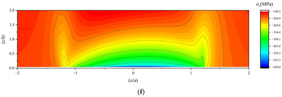 (a) The YZ-plane distribution of the stress component σX under working condition 1; (b) the XZ-plane distribution of the stress component σX under working condition 1; (c) the YZ-plane distribution of the stress component σX under working condition 2; (d) the XZ-plane distribution of the stress component σX under working condition 2; (e) the YZ-plane distribution of the stress component σX under working condition 3; (f) the XZ-plane distribution of the stress component σX under working condition 3.