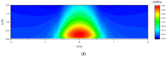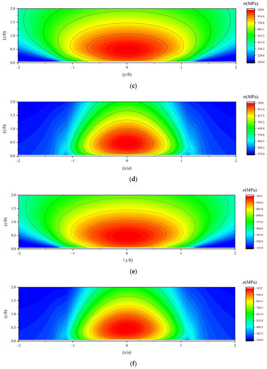 (a,b) The subsurface von Mises stress under working condition 4; (c,d) the subsurface von Mises stress under working condition 5; (e,f) the subsurface von Mises stress under working condition 6.