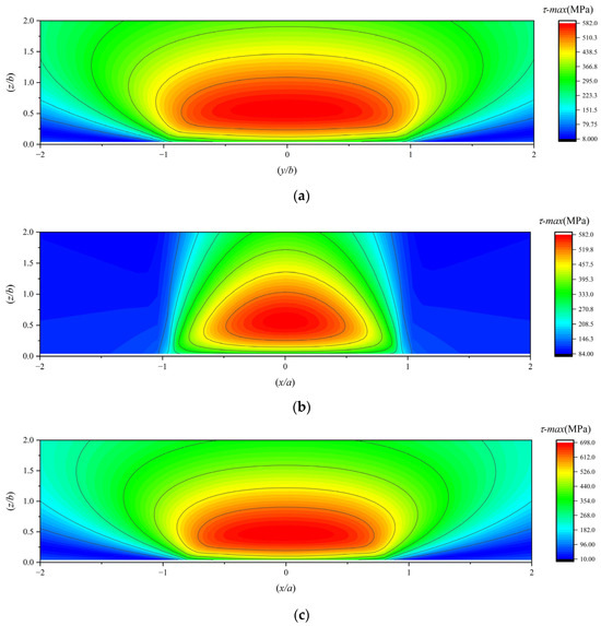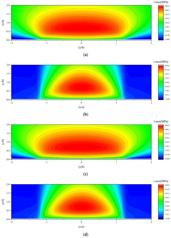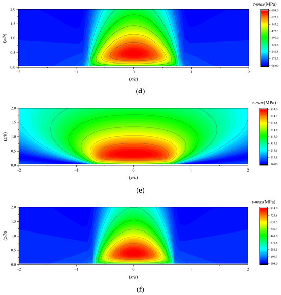 (a,b) The maximum subsurface shear stress under working condition 1; (c,d) the maximum subsurface shear stress under working condition 2; (e,f) the maximum subsurface shear stress under working condition 3.