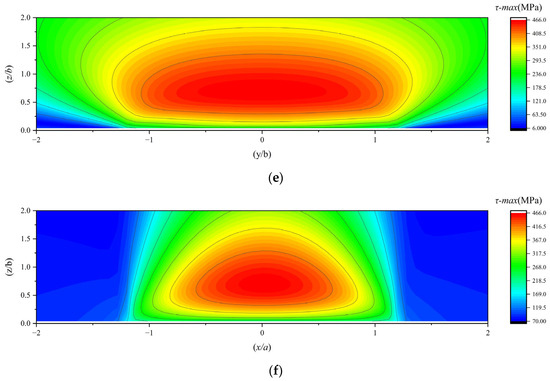 (a,b) The maximum subsurface shear stress under working condition 4; (c,d) the maximum subsurface shear stress under working condition 5; (e,f) the maximum subsurface shear stress under working condition 6.