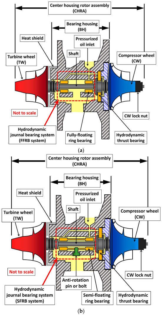 Turbochargers (TCs) are widely used in modern internal combustion engines to increase power density by forcing more air into the cylinders. A key enabler of turbocharger performance is the bearing system, which must support high-speed rotating shafts while maintaining dynamic stability, minimizing friction losses, and ensuring durability. Among commercially adopted solutions, two types of hydrodynamic journal bearings are commonly employed: fully floating ring bearings (FFRBs) and semi-floating ring bearings (SFRBs) [].