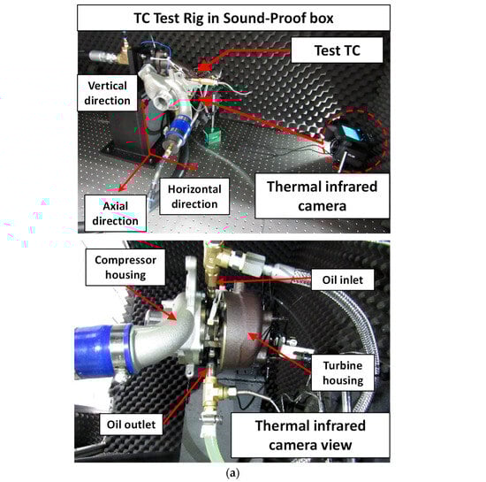 Figure 2a shows the assembled test rig inside an acoustic enclosure to minimize environmental noise. The turbocharger is mounted horizontally on an air-damped vibration isolation table, which reduces the influence of external disturbances such as those originating from the compressor or oil pump. Compressed air stored in high-capacity tanks is used to drive the turbine. A ball valve upstream of the turbine inlet provides manual control of rotor speed. To maintain consistent test conditions, the wastegate valve is fully closed, and the variable turbine geometry (VTG) vanes are fixed at their minimum opening angle.