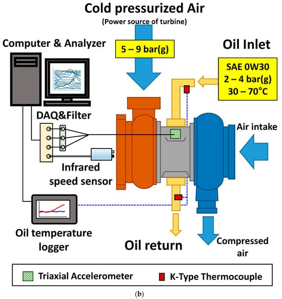 Cold air-driven test rig setup for vibration and thermal analysis. (a) Photograph of the turbocharger mounted within a soundproof enclosure on an air-damped table. (b) Schematic diagram showing the oil supply loop, data acquisition (DAQ) system, sensors, and control components.