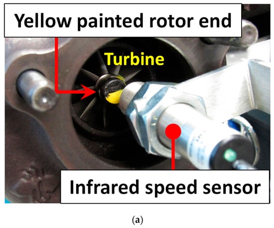 Figure 3 illustrates the two key sensors used for data acquisition. An IR speed sensor (Figure 3a) measures rotor speed by detecting a reflective yellow-painted mark on the turbine wheel, generating one pulse per revolution. A triaxial accelerometer (Figure 3b) is mounted directly on the bearing housing and measures vibrational acceleration in the vertical, axial, and horizontal directions.