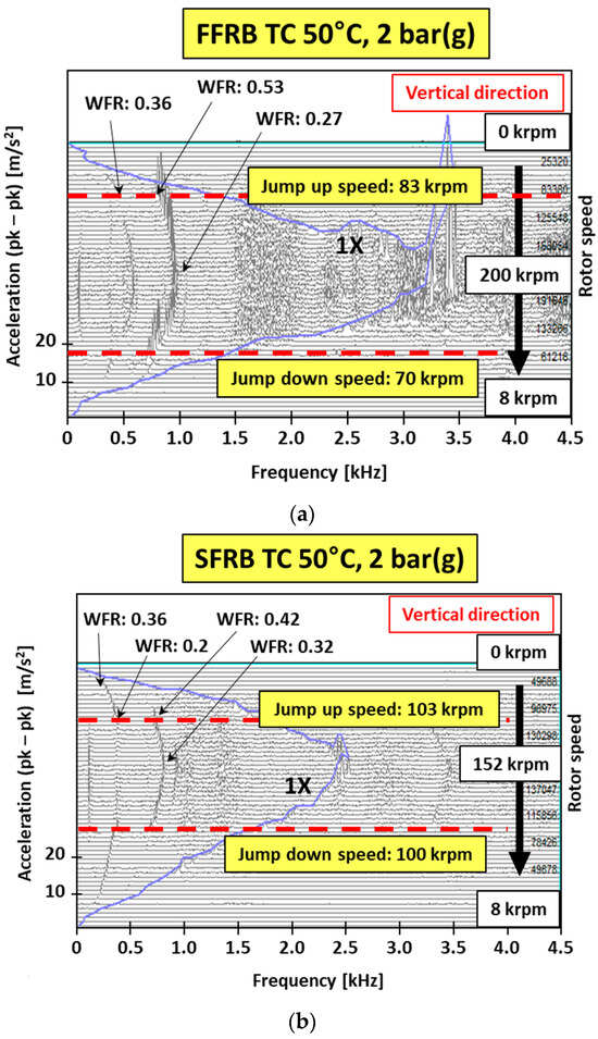 Comparison of bearing housing acceleration spectra between the FFRB and SFRB turbochargers under oil supply conditions of 50 °C and 2 bar (g). Subsynchronous frequency jumps are identified. WFR: whirl frequency ratio. (a) FFRB housing acceleration, (b) SFRB housing acceleration.