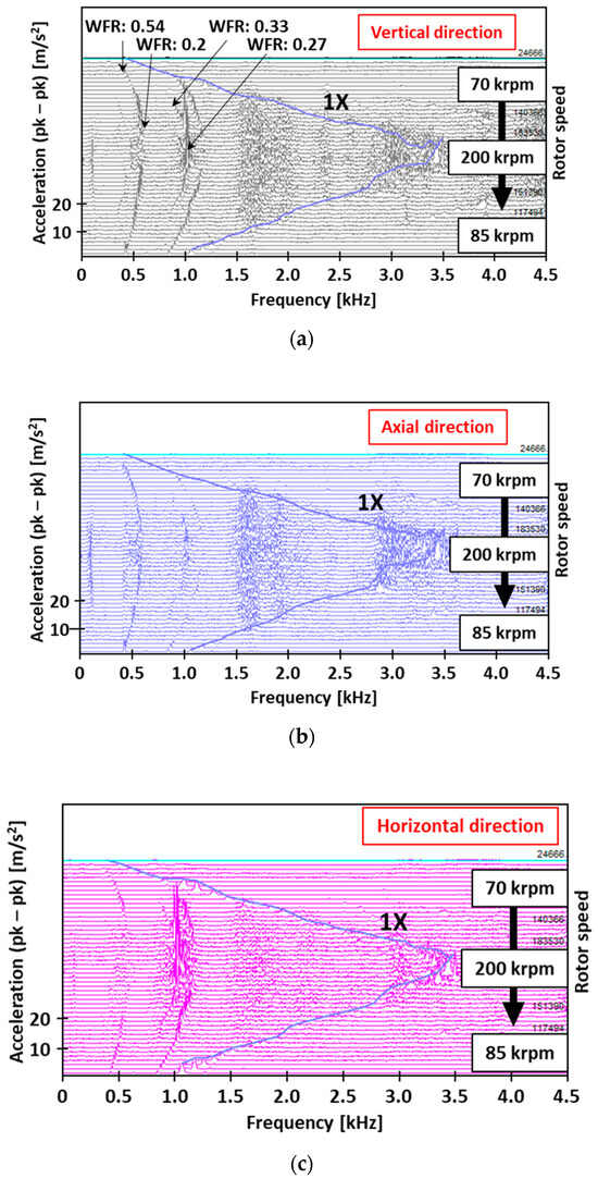 Waterfall plots of bearing housing acceleration for the FFRB-supported turbocharger under 70 °C, 2 bar (g) oil supply. (a) Vertical direction; (b) axial direction; (c) horizontal direction.