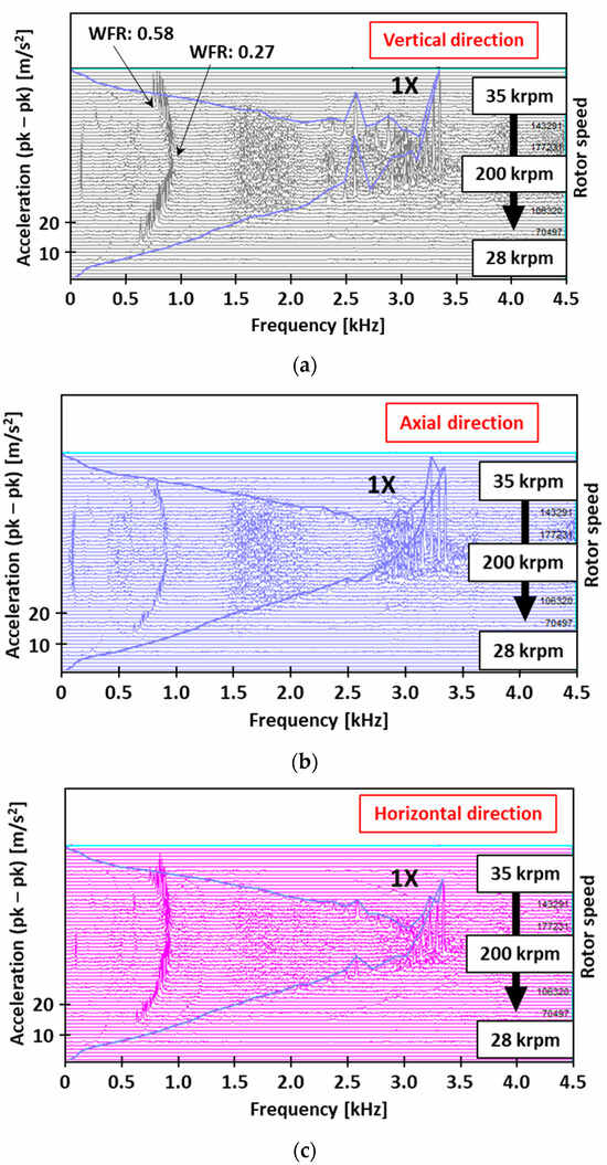Waterfall plots of bearing housing acceleration for the FFRB-supported turbocharger under 30 °C, 4 bar (g) oil supply. (a) Vertical direction; (b) axial direction; (c) horizontal direction.