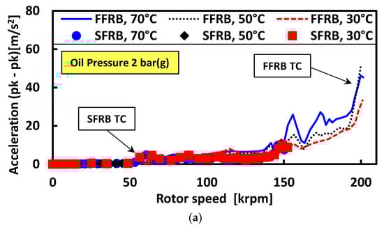 Figure 7 presents synchronous acceleration amplitudes for both FFRB- and SFRB-supported turbochargers under a fixed oil temperature of 30 °C and three different oil pressures: 2 bar (g), 3 bar (g), and 4 bar (g). Up to approximately 150 krpm, both systems showed relatively low and stable synchronous responses. Beyond this speed, the FFRB system exhibited a rapid increase in amplitude, particularly at the lowest pressure, indicating proximity to a resonance or loss of dynamic stiffness. In contrast, the SFRB system maintained a smoother and lower synchronous response across the entire speed range, with minimal influence from oil pressure.