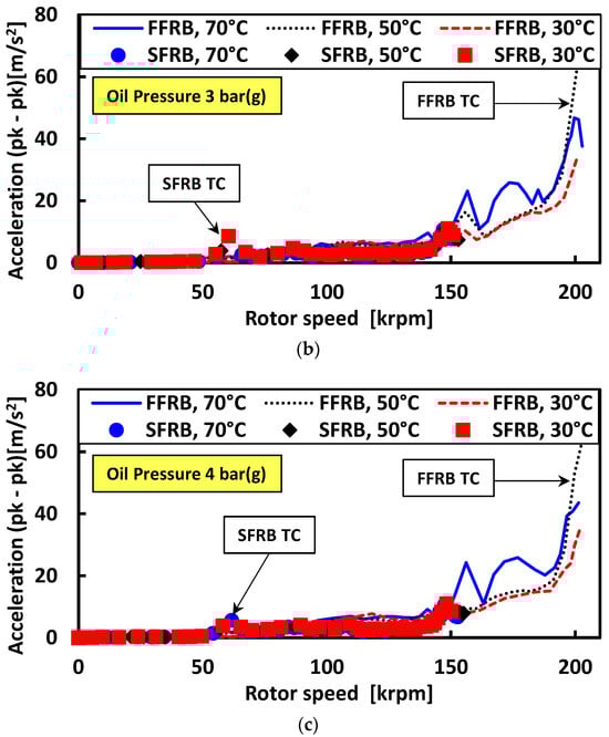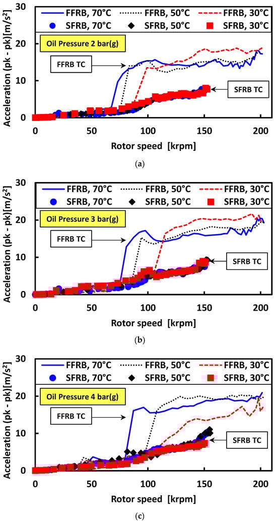 Synchronous acceleration amplitudes versus rotor speed (vertical direction) for the FFRB and SFRB turbochargers under 30 °C oil temperature and (a) 2 bar (g), (b) 3 bar (g), and (c) 4 bar (g) oil pressure conditions.