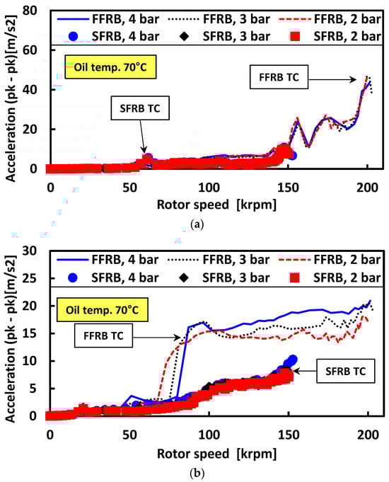 Figure 9 further examines the impact of oil pressure on both synchronous and subsynchronous amplitudes at a fixed oil temperature of 70 °C. For the FFRB turbocharger, increasing pressure led to a noticeable delay in the onset of subsynchronous growth and reduced post-jump amplitudes. The synchronous response, however, remained relatively unaffected by pressure. The SFRB results showed little variation with pressure, reaffirming the robustness of this configuration to changes in lubrication conditions.