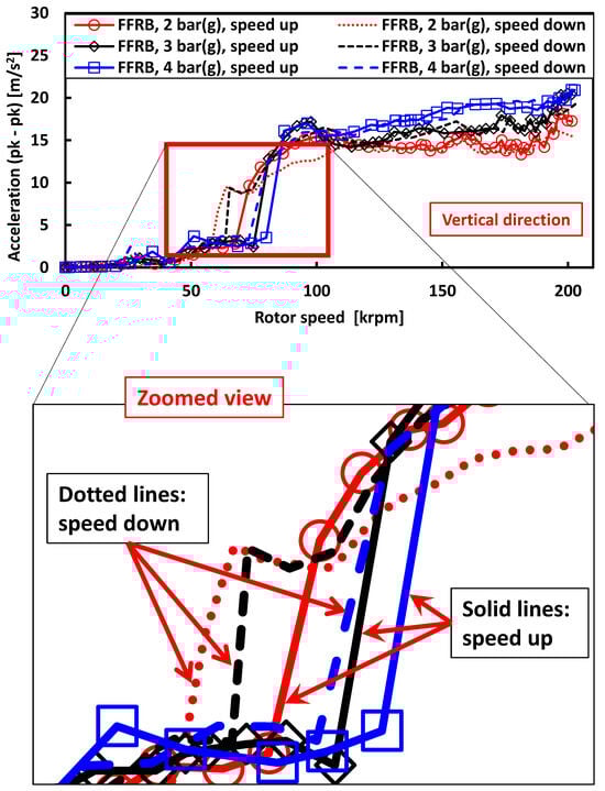 The observed hysteresis behavior in the FFRB configuration, consistent with the findings in Figure 10, suggests a strong dependence on the operating trajectory. Such characteristics may lead to persistent vibration even as speed is reduced, complicating control strategies in variable-speed applications. The SFRB system’s lack of hysteresis and reduced sensitivity to pressure and temperature shifts make it a more robust solution for consistent high-speed operation.