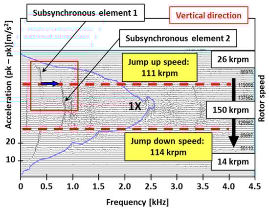 In contrast, the high-temperature case in Figure 6 shows a relatively simpler spectral profile. The jump occurred earlier, near 60 krpm, and the synchronous component remained dominant throughout the speed range. The critical speed appeared near 150 krpm, though without pronounced resonance peaks. Post-jump, subsynchronous components grew moderately but remained lower in amplitude compared to the cooler oil case.