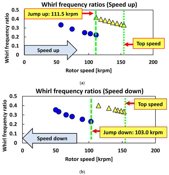 Whirl frequency ratio (WFR) as a function of rotor speed in the SFRB-supported turbocharger under 50 °C, 4 bar (g). (a) Acceleration phase; (b) deceleration phase. (Blue circle symbol: subsynchronous element 1; yellow triangle symbol: subsynchronous element 2).